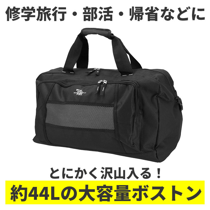 お子様の修学旅行用バッグとしてはもちろん、部活やスポーツイベント用のバッグとしても活躍する大容量44リットル!・フロントのオオカミのロゴが配置されたラウンド式ファスナーポケットは、マチが張り出した立体的な構造。